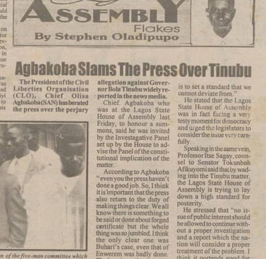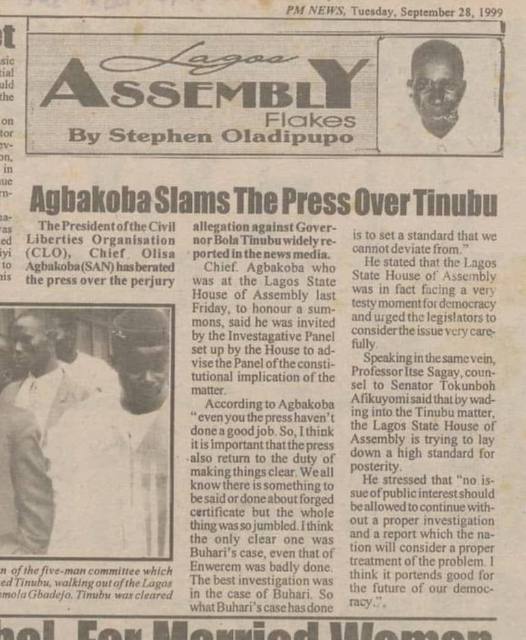 On the 29th of September, 1999, Chief Olisa Agbakoba, SAN, delivered what history should remember as one of the fiercest rebukes ever hurled at the Nigerian press. Standing tall in the Lagos State House of Assembly, he did not whisper, he roared, scathingly criticising the media for their shameful neglect of the grave issue of Bola Ahmed Tinubu’s certificate forgery.